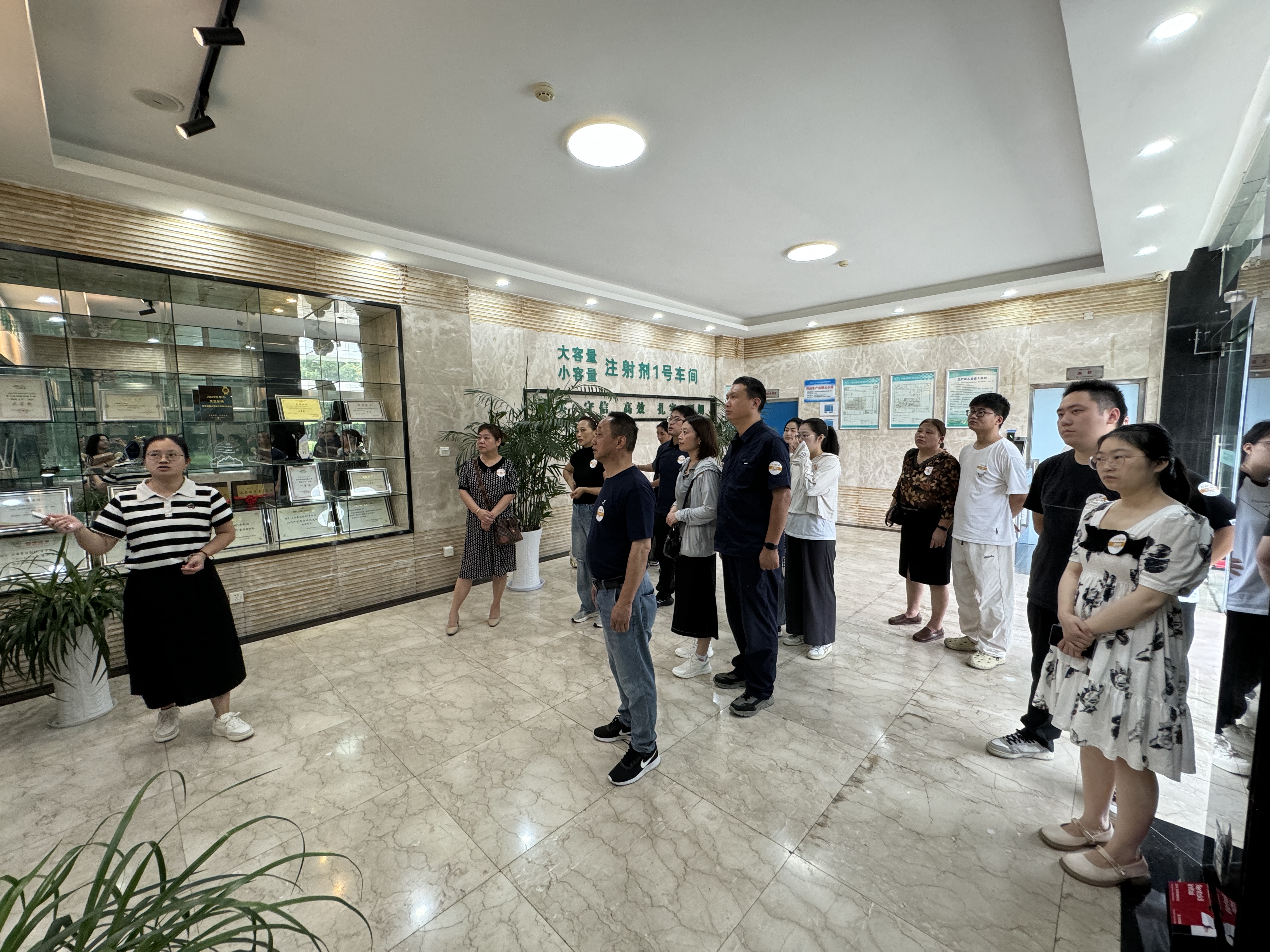 海陵基于此LOGO定制了一系列紀(jì)念品,包括太陽帽、太陽傘、帆布包及合影板。這些定制品貫穿于家屬日的各個(gè)環(huán)節(jié),讓每一位參與者都能感受到了公司的貼心與關(guān)懷。特別9月13日上午,家屬們首先在“南京海陵第九屆家屬日”的合影板前留下了珍貴的瞬間。鏡頭下,每一位工匠與家屬的笑容都洋溢著幸福與期待,為接下來的活動拉開了溫馨的序幕。隨后,他們正式開啟了參觀之旅,依次走進(jìn)了小容量注射劑1號車間、固體制劑1號車間、檢測中心、物料倉庫和行政樓。每到一處,專業(yè)講解員都耐心地為家屬們介紹生產(chǎn)流程、質(zhì)量檢測、倉庫管理以及企業(yè)文化,讓家屬們零距離感受到了海陵“為親人制藥、為父母制藥”的質(zhì)量文化。